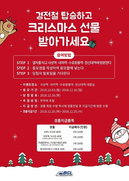 부산김해경전철은 경전철 이용객을 위한 크리스마스 맞이 고객 감사 이벤트를 진행한다고 3일 밝혔다.