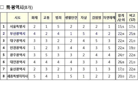 올해 부산시는 행안부가 발표한 지역안전지수에서 생활안전 1등급, 교통 2등급, 자연재해 2등급 등 7개 분야 도합 22등급을 받아 전국 8개 특·광역시 가운데 4위를 기록했다. 지난해는 도합 25등급으로 전국 최하위인 8위에 그쳤다.