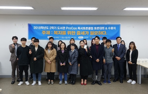 '도서관 ProCon 독서토론클럽'은 대학인문역량강화사업(CORE)의 하나로 학생들의 인문학적 역량을 강화하기 위해 마련됐으며, 4기 학생들은 '미래를 보는 눈'이라는 주제로 8주간 3가지 도서를 선정해 읽고, 발표하고 토론하는 형태로 진행됐다.