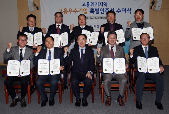 이번 특별인증은 고용위기지역내의 고용창출 분위기를 확산하고 고용위기 극복의 전기를 마련하기 위한 목적으로 마련되었으며, 특별 인증서 수여식에는 문승욱 경제부지사를 비롯해 고용우수기업으로 선정된 9개 기업대표 등 30여 명이 참석했다.