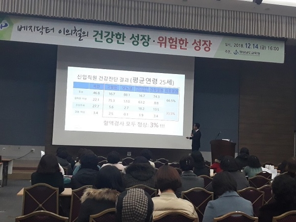 이번 강연회는 식생활 습관의 중요성에 대한 인식개선을 위해 다양한 활동을 하고 있는 대전 선병원 이의철 직업환경의학센터장이 '건강한 성장·위험한 성장'을 주제로 특강을 진행했다.