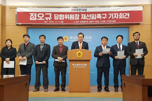 자유한국당 부산 서·동구 당원협의회 선출직 인사들이 17일 자유한국당 비상대책위원회에 정오규 당협위원장 교체를 철회할 것을 촉구하고 나섰다.