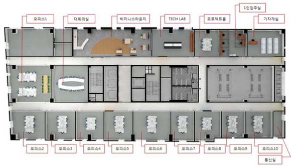 주요 시설로 입주지원실 10실, 1인 사무실 5실, Tech LAB, 비즈니스 라운지, 프로젝트룸, 회의실 등으로 구성됐다.
