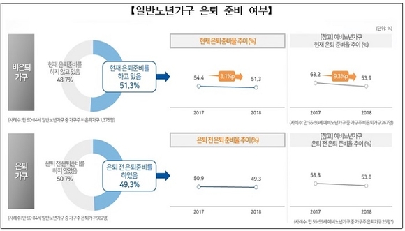 고령층의 은퇴준비율은 전년보다 하락한 것으로 나타났다. 일반 노년가구 중 비은퇴가구의 은퇴준비율은 51.3%로 전년대비 3.1%p 떨어진 것으로 집계됐다.