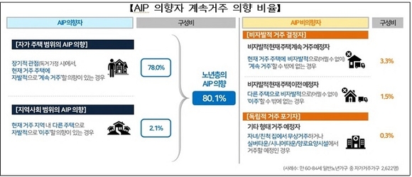 아울러 ‘자가 주택 범위 AIP 의향자’ ‘지역사회 범위 AIP 의향자’ 모두 익숙한 환경에서 사는 것이 편하다는 정서적 측면과 주거비용 최소화 등 경제적 측면에서의 이유를 가장 많이 꼽았다.
