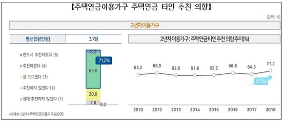 주택연금 이용가구의 타인 추천의향에 대한 조사에서는 전년대비 6.9%p 오른 71.2%가 주택연금을 추천할 의향이 있다고 답했다.