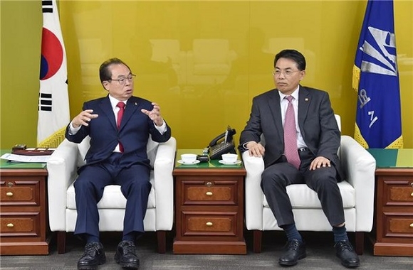 오거돈 시장은 19일 오전 부산 철도시설 및 김해공항 현장 방문을 위해 예방한 김정렬 국토교통부 제2차관을 시청에서 접견했다.