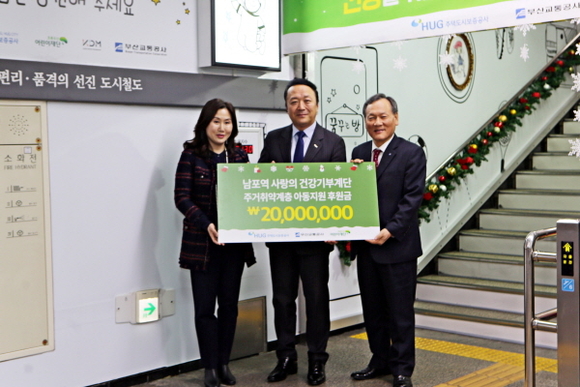 주택도시보증공사(HUG)가 지난 19일 부산도시철도 1호선 남포역에서 ‘HUG 사랑의 계단’ 사업 1주년을 맞아 기부금 전달식을 열었다고 20일 밝혔다.