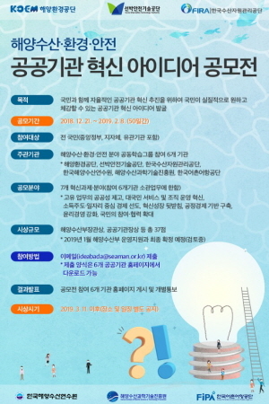 해양수산부 산하 6개 공공기관이 공동으로 지난 21일부터 내년 2월 8일까지 ‘해양수산‧환경‧안전 ’공공기관 혁신 국민 아이디어 공모전‘을 연다고 24일 밝혔다.