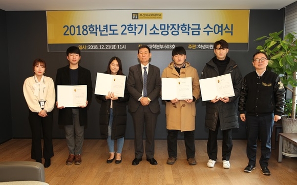 부산외국어대학교는 지난 21일 대학본부에서 '소망장학금' 수여식을 열고, 재학생 5명에게 장학증서를 수여했다고 26일 밝혔다.