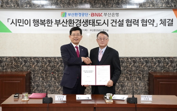 BNK부산은행이 27일 오전 부산환경공단 회의실에서 공단과 협약을 맺고 부산환경생태도시 건설을 위해 상호 협력하기로 했다고 밝혔다.