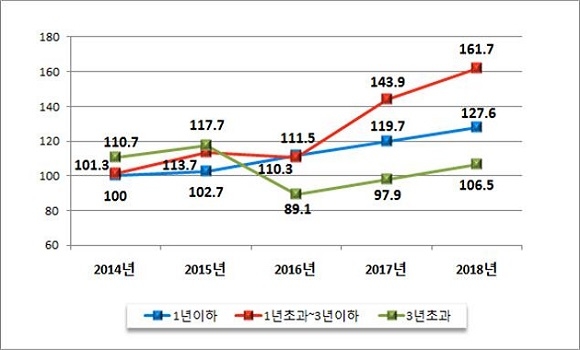 만기 구조별로는 중기채권(1년 초과, 3년 이하)이 약 161조 7000억원, 장기채권(3년 초과)이 106조 5000억원, 단기채권(1년 이하) 127조 6000억원이 등록발행 됐다. 이는 전년대비 각 12.4%(17조 8000억원), 8.8%(8조 6000억원), 6.6%(7조 9000억원)씩 증가한 셈이다.
