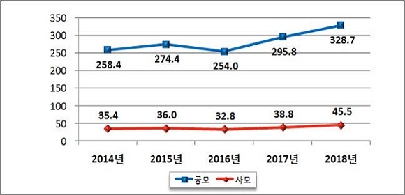 모집 유형별로는 공모채권이 약 328조 7000억원으로 전년대비 11.1%(32조 9000억원) 증가했다. 사모채권은 약 45조 5000억원으로 전년보다 17.3%(6조 7000억원) 늘어났다.