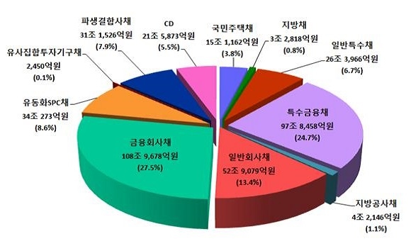 예탁결제원 자료에 따르면 지난해 등록발행채권 가운데 금융회사채가 27.5%로 가장 비중이 높았으며 이어 특수금융채, 일반회사채, 유동화 SPC채, 파생결합사채 등의 순으로 나타났다.