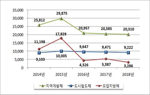 지방채 가운데 지역개발채가 2조 310억원, 도시철도채 9222억원, 모집지방채 3286억원으로 전년대비 각각 1.3%(275억원), 2.6%(249억원), 39%(2101억원)씩 줄어든 것으로 집계됐다.