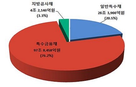 특수채 가운데 일반특수채가 26조 3966억원, 특수금융채 97조 8458억원, 지방공사채 4조 2146억원이 등록발행 돼 전년대비 각각 0.5%(1324억원), 12.3%(10조 7368억원), 3.6%(1484억원)씩 늘어났다.