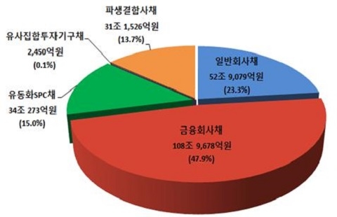 회사채 가운데 일반회사채가 52조 9079억원, 금융회사채 108조 9678억원, 유동화 SPC채 34조 273억원, 유사집합투자기구채 2450억원, 파생결합사채 31조 1526억원이 발행돼 전년대비 각 14%, 13.6%, 18.3%, 984.1%, 10.6%씩 증가했다.