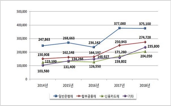그중 최대 비중을 차지한 금융회사채는 전체 회사채 가운데 47.9%를 차지했다. 금융회사채 종류별로는 일반은행채가 37조 5100억원으로 전년대비 0.5% 감소했다. 반면 할부금융채, 신용카드채, 지주회사채 등 기타금융회사채는 각각 9.5%, 19.1%, 47.6%씩 증가했다.