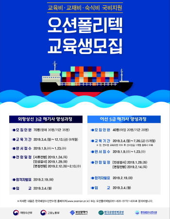 한국해양수산연수원은 2019년도 오션폴리텍 외항상선 3급과 어선 5급 해기사 양성과정 교육생을 모집한다고 14일 밝혔다.