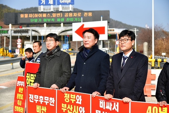 변광용 거제시장이 15일 오후 거가대교 요금소(거제방향)에서 '거가대교 통행료 인하 범시민대책위원회'가 주관한 거가대교 통행료 인하를 위한 단체집회에 동참했다.