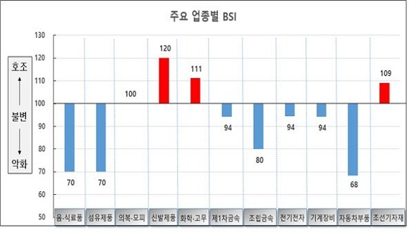 반면 신발 120, 화학고무 111, 조선기자재 109 등 일부 업종은 글로벌 수요 증가와 업황 회복으로 경기가 다소 호전될 것으로 전망했다.