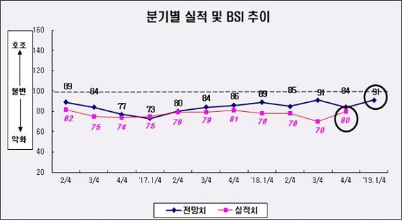 1분기 제조업 경기전망지수는 91을 기록했다. 기업인들의 체감경기는 여전히 어려움을 많이 호소하고 있는 가운데 일부 업종에서 기대심리가 반영되면서 전분기 84에 비해 약간 개선됐다.