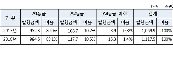 신용등급별로는 A1 984조 5000억원, A2 117조 7000억원, A3 이하 15조 3000억원 순으로 신용등급이 낮아질수록 발행량이 감소하는 추세를 보였다.