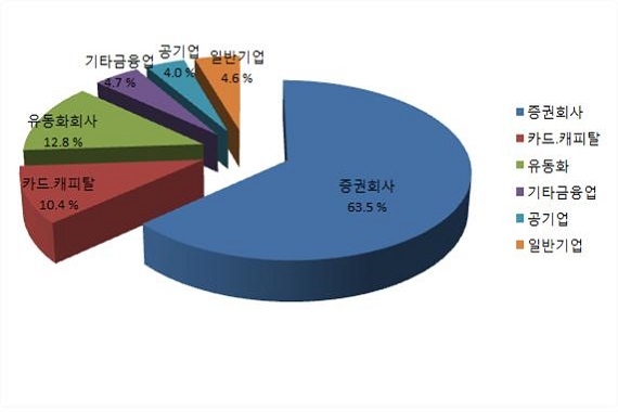 업종별 발행량은 증권회사(63.5%), 유동화회사(12.8%), 카드·캐피탈(10.4%), 기타금융업(4.7%), 일반기업(4.6%), 공기업(4.0%) 순으로 많았다.