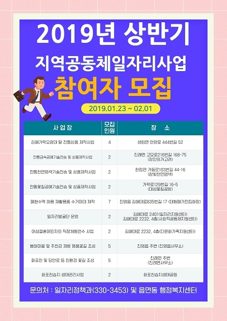 상반기 사업은 3월 1일부터 6월 30일까지 4개월간이나, 연속적으로 2년 동안 참여 가능하며 23일부터 2월 1일까지 모집해 총 11개 사업장에 33명을 배치할 계획이다.
