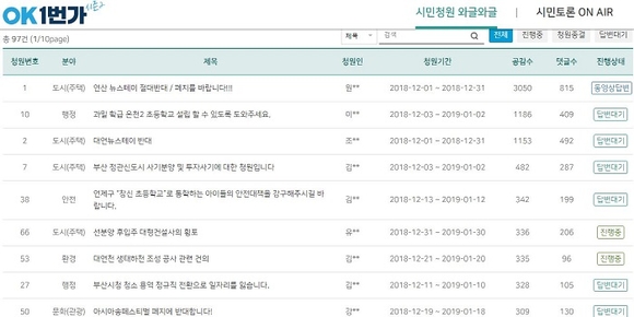 또 부산시는 지난해 OK 1번가 시즌2 청원 기간인 한 달 동안 공감 300개가 넘을 경우 해당 부서에서 공식답변을 내놓기로 했었다. 반면 이에 대한 공식 답변은 아직 한 건도 없는 상황이다.