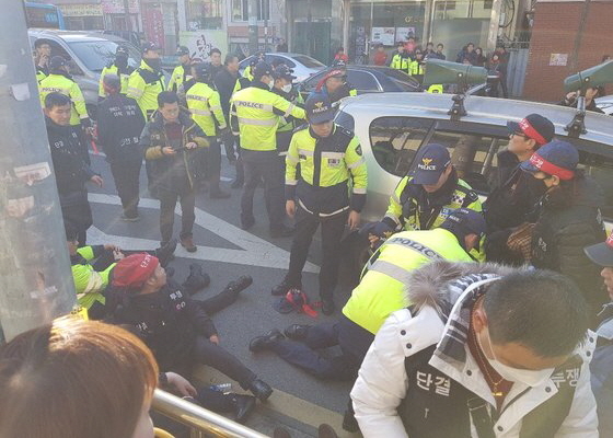 25일 부산지방경찰청과 부산시에 따르면 지난 24일 오후 3시 46분경 덕포동 사상초등학교 인근에서 진행된 덕포1구역 재개발 반대 집회 현장에서 승합차가 집회 참가자들과 경찰관을 덮쳤다.