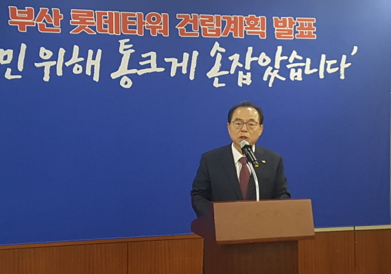 부산시와 롯데그룹은 28일 오후 2시 부산시청에서 기자회견을 열고 부산 롯데타워 계획안을 발표했다. 롯데는 이날 “이번엔 롯데타워 계획안대로 반드시 이행하겠다. 호텔 등 주거시설은 계획 없다”고 밝혔다.