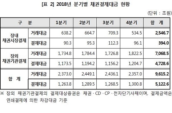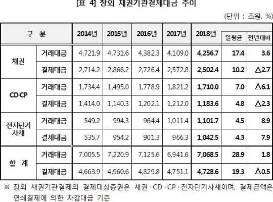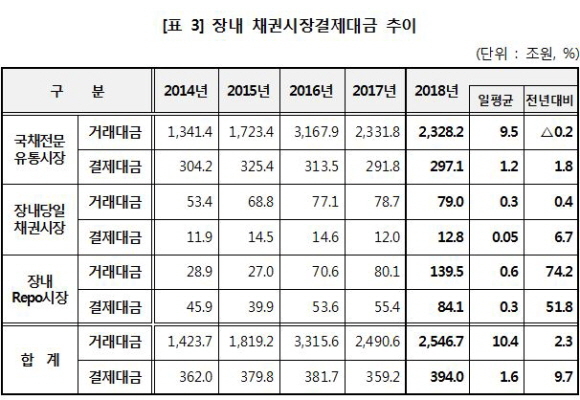 자료에 따르면 장내 채권시장결제대금은 394조원으로 전년보다 9.7% 증가했으며 장외 채권기관결제대금은 4728조 6000억원으로 전년대비 0.5% 감소했다.