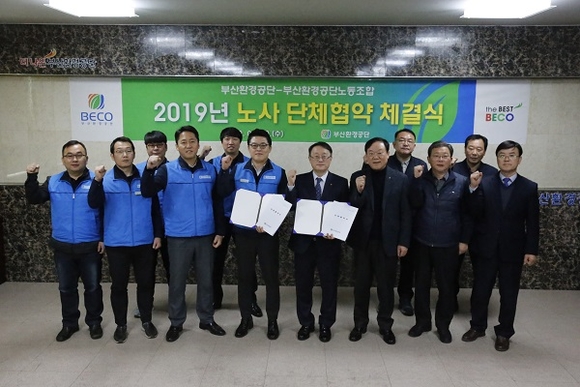 부산환경공단이 30일 공단 본부 3층 회의실에서 사측 대표 7명과 노조측 대표 7명이 ‘2019 단체협약 체결식’을 진행했다고 밝혔다.