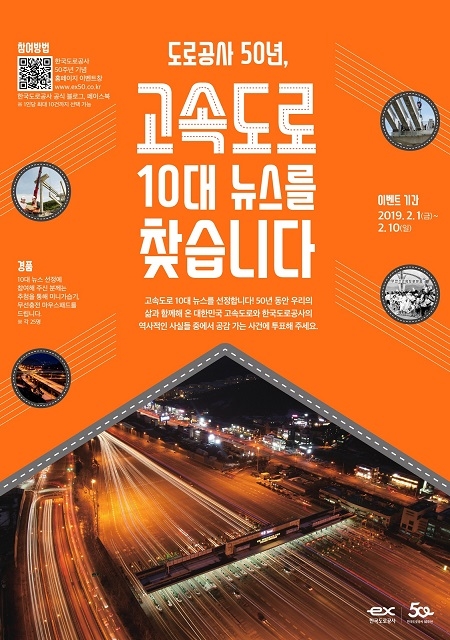 한국도로공사는 2월 1일부터 10일까지 창립 50주년을 기념해 '고속도로 10대 뉴스'를 선정하는 이벤트를 진행한다고 31일 밝혔다.