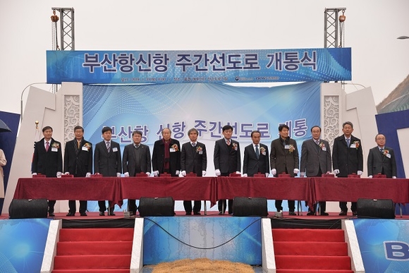 부산지방해양수산청은 부산항 신항의 늘어나는 교통량을 해소하고 물류 수송기능을 향상하기 위해 부산항 신항 주간선도로를 이날 오후 4시에 개통했다고 밝혔다.