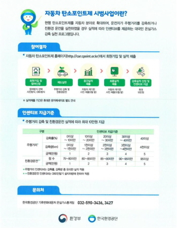 자동차 탄소포인트제는 운전자가 주행거리를 줄이거나 급가속·급제동 등을 하지 않고 친환경 운전을 해 온실가스를 감축할 경우 실적에 따라 최대 10만원의 혜택을 주는 제도다.