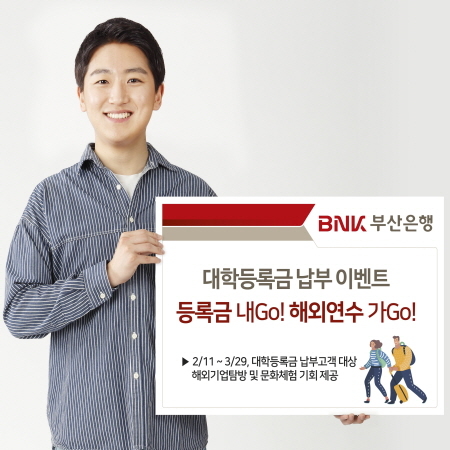 BNK부산은행이 대학등록금 납부 시기를 맞아 11일부터 내달 29일까지 대학등록금 납부 행사인 ‘등록금 내Go! 해외연수 가Go!’를 진행한다고 밝혔다.