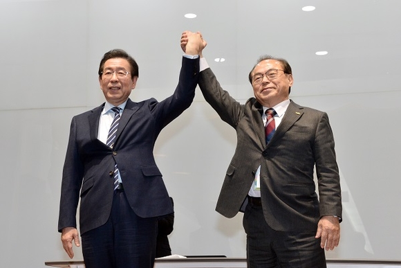 박원순 서울시장과 오거돈 부산시장은 지난 11일 오후 충북 진천 대한체육회 대의원 총회에 참석해 하계올림픽 국내 유치도시로서 당위성과 준비 상황을 각각 발표했다.