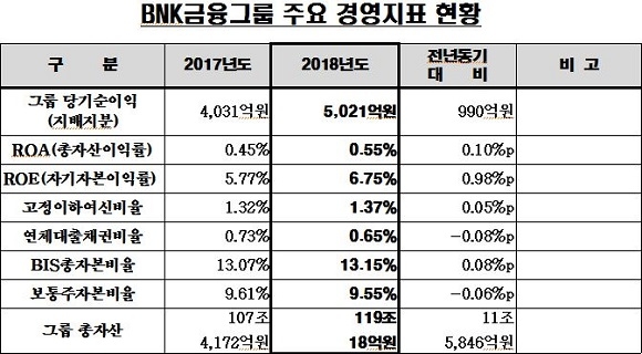 BNK금융그룹이 12일 2018년도 실적을 발표하고 지난해 당기순이익 5021억원을 기록해 전년보다 24.6%(990억원) 늘어난 실적을 달성했다고 밝혔다.
