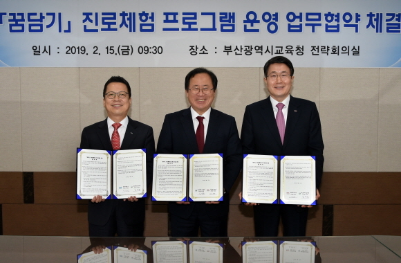 부산시교육청이 15일 오전 시교육청 전략회의실에서 한국거래소와 BNK부산은행과 ‘꿈을 담아내는 기업(꿈담기)’ 진로체험 프로그램 운영을 위한 업무협약을 체결했다고 밝혔다.