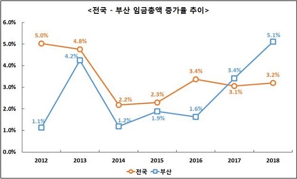 이는 전국 평균 상승률 3.2%보다 높다. 부산상의는 지역 임금수준이 크게 오른 이유로 상용근로자가 주요 대도시 중 가장 많이 증가하고 최저임금 인상분이 지역 전 산업에 걸쳐 반영됐기 때문이라고 분석했다.