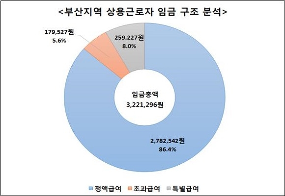 또 최저임금의 반영으로 정액급여가 임금총액에서 차지하는 비중도 86.4%로 전국 평균(83.4%)보다 높다. 임금총액은 정액급여와 초과급여, 특별급여로 구성된다.