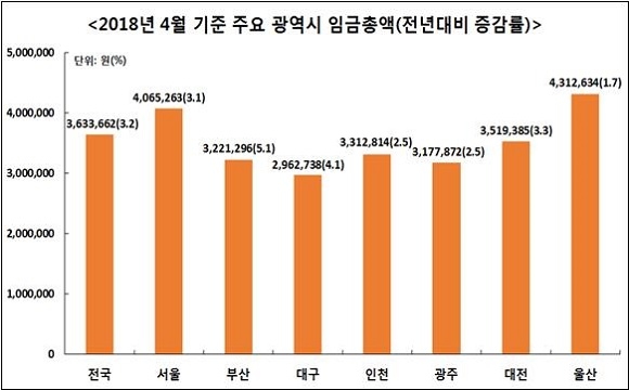 서울 제외 전국 16개 시·도 가운데 12위에 머물렀다. 상용근로자 1인당 월 총액임금이 가장 높은 지역은 울산으로 431만원이었다.