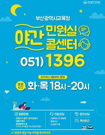 시교육청은 내달부터 매주 화·목요일 오후 6시부터 8시까지 고객지원실에서 야간 민원실을, 부산교육콜센터에서 야간 콜센터를 각각 운영한다.
