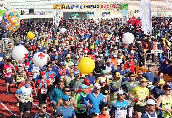 밀양시가 주최하고 밀양시육상연맹이 주관한 이번 대회는 9560명이 참가 신청해 작년보다 809명이 늘었다. 부문별로는 하프 3206명, 10km 3517명, 5km 2837명의 마라토너들이 힘찬 레이스를 펼쳤다.