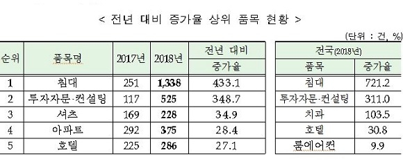 전년대비 상담 신청 증가율이 많이 오른 상위 5개 품목은 ▲침대(433.1%) ▲투자자문·컨설팅(348.7%) ▲셔츠(34.9%) ▲아파트(28.4%) ▲호텔(27.1%) 순이었다.
