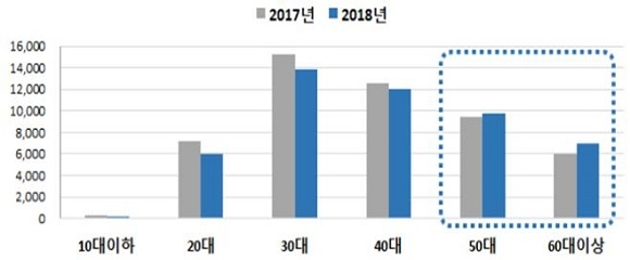 연령대별로는 30대가 28.3%(1만 3861건)로 가장 많았고 40대 24.7%(1만 2070건), 50대 20.1%(9815건) 순으로 뒤를 이었다. 성별은 여성이 55.4%(2만 8714건)로 남성보다 10.8%p 높았다.