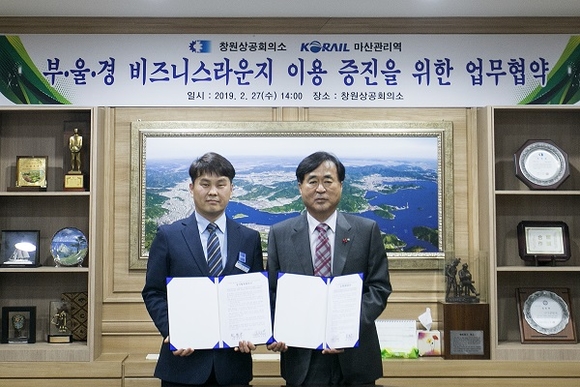 창원상공회의소는 27일 3층 소회의실에서 한국철도공사 마산관리역과 '부울경 비즈니스라운지 이용 증진을 위한 업무협약(MOU)'을 체결했다.