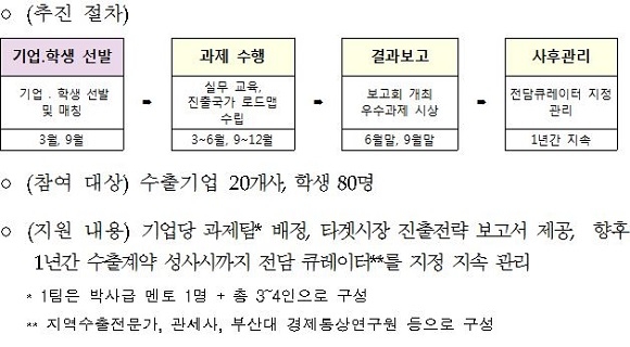 중소기업 수출전략 수립지원사업은 지역 내 수출역량이 부족한 중소기업과 부산대학생의 창의적 아이디어를 연결해 일자리 창출과 수출을 도모하는 사업이다.